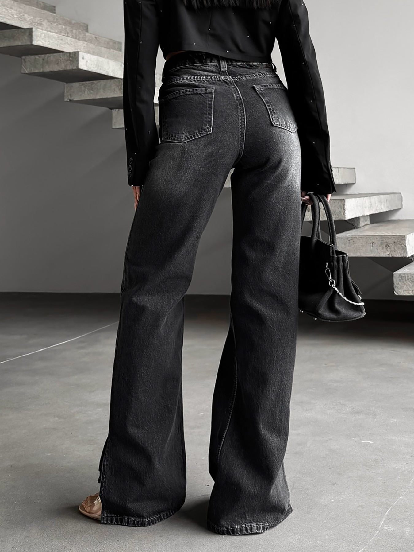 Sublimez votre style avec ce jean en denim noir chic et moderne ! Sa taille haute flatteuse et sa coupe légèrement évasée mettent en valeur vos jambes tout en offrant un confort optimal. Avec sa finition lavage aux enzymes et délavage léger, ce jean combine style minimaliste, élégance et tendance pour un look parfait au bureau ou en ville.